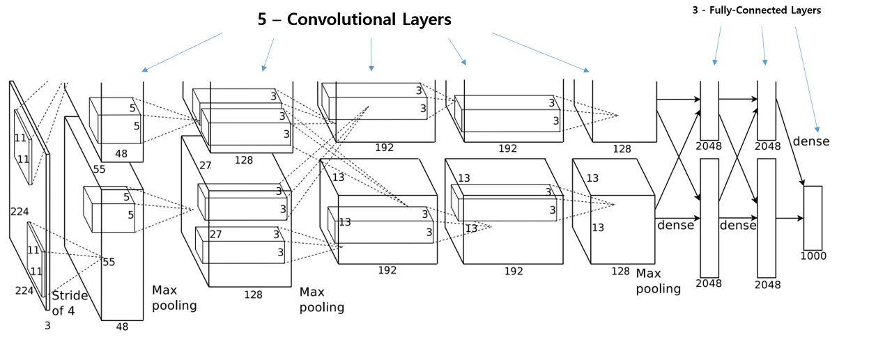 저 당시에는 GPU 메모리가 부족하여 학습을 하나의 gpu로 실행하지 못하고 2개의 gpu에 나누어 실행하여 중간 층들이 2개이다.